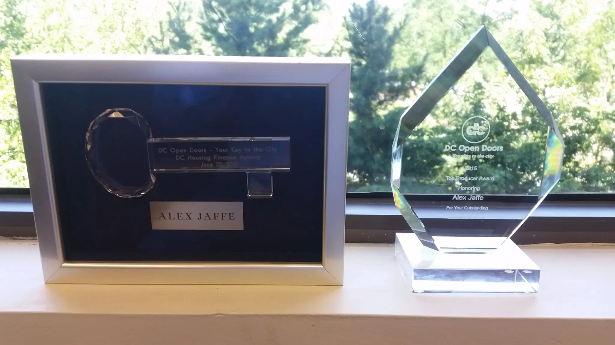 On the left – Award for providing the first DC Open Doors loan. On the right -Award for being the Top Producer for DC Open Doors